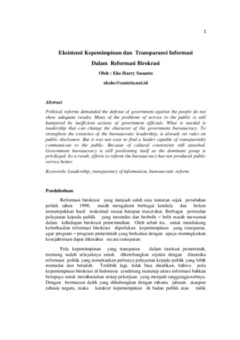Susanto, Eko Harry (2011) Eksistensi Kepemimpinan dan Transparansi Informasi Dalam Reformasi Birokrasi. Karya Ilmiah Dosen. pp. 1-11.