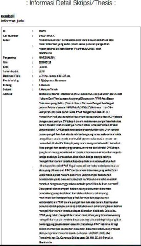 Kata Kunci : Akta, PPAT Pengalihan Hak. (E) Isi : Pengalihan hak atas tanah berdasarkan kesepakatan antara CV Kokopit dengan penjualnya. CV kokopit dalam melakukan pengalihan hak atas tanah diwakili oleh direksinya namun tidak lama kemudian direksi yang mewakili CV Kokopit tersebut mengundurkan diri. Oleh karena proses pengalihan hak atas tanah berlangsung lama maka setelah akta pengalihan tanah tersebut selesai diproses maka masih tercantum nama dari direksi CV Kokopit yang telah mengundurkan diri tersebut. Akta pengalihan tanah yang tercantum nama dari direksi CV Kokopit yang telah mengundurkan diri tersebut kemudian dihibahkan kepada ketiga anaknya. Berdasarkan akta hibah ketiga orang anaknya mengalihkan tanah tersebut kepada pihak lain sebanyak dua kali dihadapan Notaris/PPAT. Bagaimana akibat hukum dari pembuatan akta yang dibuat oleh PPAT berdasarkan dokumen yang keliru? dan Bagaimana akibat hukum bagi PPAT yang mengalihkan tanah berdasarkan pada dokumen yang keliru? Penulis meneliti masalah tersebut dengan menggunakan metode penelitian hukum normatif. Data penelitian memperlihatkan adanya dokumen-dokumen pendukung yang disalahartikan oleh salah satu pihak yang menimbulkan kerugian bagi pihak lainnya dan juga adanya ketidaktelitian PPAT dalam pengalihan hak atas tanah. Kesimpulan penulis adalah perjanjian yang dilakukan oleh pihak yang tidak berhak mengalihkan tanah tersebut dapat dikatakan tidak sah. Selain itu, PPAT yang telah mengalihkan tanah dari pihak yang tidak berwenang mengalihkan tanah tersebut kepada orang lain adalah pihak yang ikut bertanggung jawab dalam kasus ini. Sebaiknya PPAT lebih teliti lagi dalam memeriksa keabsahan dokumen-dokumen sebelum membuat akta pengalihan hak atas tanah. (F) Acuan : 20 (1984-2008). (G) Pembimbing : Dr. Gunawan Djajaputra, SH, MH, SS. (H) Penulis : Marshalrin.