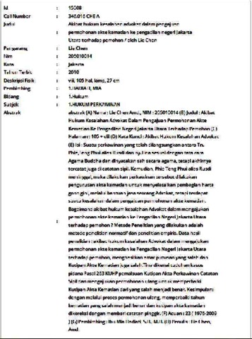 Chen, Lie and Hadiati, Mia (2010) Akibat hukum kesalahan advokat dalam pengajuan permohonan akte kematian ke pengadilan negeri Jakarta Utara terhadap pemohon. Informasi Detail Skripsi. ISSN 205010014