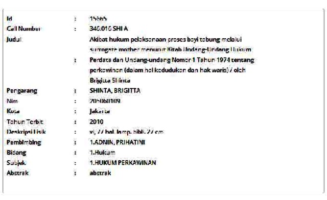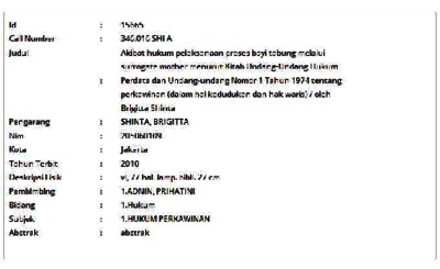 Shinta, Brigitta (2010) Akibat hukum pelaksanaan proses bayi tabung melalui surrogate mother menurut Kitab Undang-Undang Hukum Perdata dan Undang-undang Nomor 1 Tahun 1974 tentang perkawinan (dalam hal kedudukan dan hak waris). Informasi Detail Skripsi. p. 77. ISSN 205060109