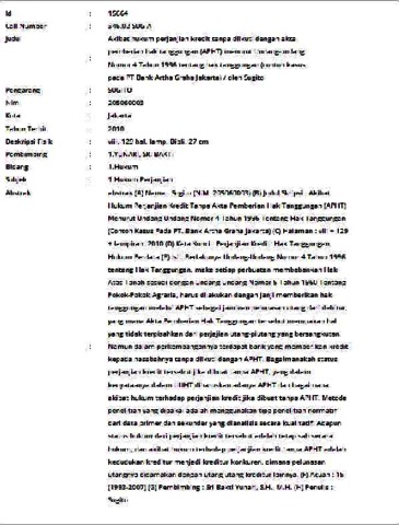 Sugito, Sugito (2010) Akibat hukum perjanjian kredit tanpa diikuti dengan akta pemberian hak tanggungan (APHT) menurut Undang-undang Nomor 4 Tahun 1996 tentang hak tanggungan (contoh kasus pada PT Bank Artha Graha Jakarta). Informasi Detail Skripsi. p. 129. ISSN 205060003