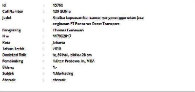 Gunawan, Thomas (2010) Analisa kepuasan konsumen yang menggunakan jasa angkutan PT Pancaran Darat Transport. Informasi Detail Skripsi/Thesis. p. 69. ISSN 117082817