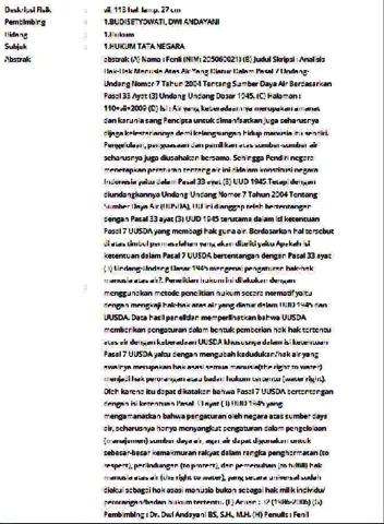 Fenli, Fenli (2010) Analisis hak-hak manusia atas air yang diatur dalam Pasal 7 Undang-undang Nomor 7 atahun 2004 tentang Sumber Daya Air berdasarkan Pasal 33 ayat (3) Undang-undang Dasar 1945. Informasi Detail Skripsi/Thesis. p. 113. ISSN 205060021