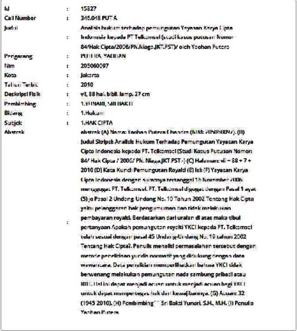(A) Nama: Yaohan Putera Chandra (NIM: 205060097). (B) Judul Skripsi: Analisis Hukum Terhadap Pemungutan Yayasan Karya Cipta Indonesia kepada PT. Telkomsel (Studi Kasus Putusan Nomor: 84/ Hak Cipta / 2006/ PN. Niaga.JKT.PST.-) (C) Halaman: vii + 88 + 7 + 2010 (D) Kata Kunci: Pemungutan Royalti (E) Isi: (F) Yayasan Karya Cipta Indonesia dengan suratnya tertanggal 16 November 2006 menggugat PT. Telkomsel. PT. Telkomsel digugat dengan Pasal 1 ayat (5) jo Pasal 2 Undang-Undang No. 19 Tahun 2002 Tentang Hak Cipta yaitu pelanggaran hak pengumuman dan tidak melakukan pembayaran royalti. Berdasarkan dari uraian di atas maka tibul pertanyaan Apakah pemungutan royalti YKCI kepada PT. Telkomsel telah sesuai dengan pasal 45 Undang-Undang No. 19 tahun 2002 Tentang Hak Cipta?. Penulis meneliti permasalahan tersebut dengan metode penelitiaan yuridis normatif yang didukung dengan data wawancara. Data penelitian memperlihatkan bahwa YKCI tidak berwenang melakukan pemungutan nada sambung pribadi atau RBT. Hal ini dapat menjadi acuan untuk menjadi acuan bagi YKCI untuk dapat mempertegas hak dan kewajibannya. (G) Acuan: 32 (1945-2010). (H) Pembimbing`` Sri Bakti Yunari, S.H., M.H. (I) Penulis Yaohan Putera