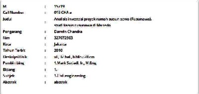 This thesis discusses about investing in construction of rumah susun sewa project. The data that is processed comes from the project owner. The analysis process starts from the investment data to find out details of the investment that needed to build a rusunawa project. Then proceed by making