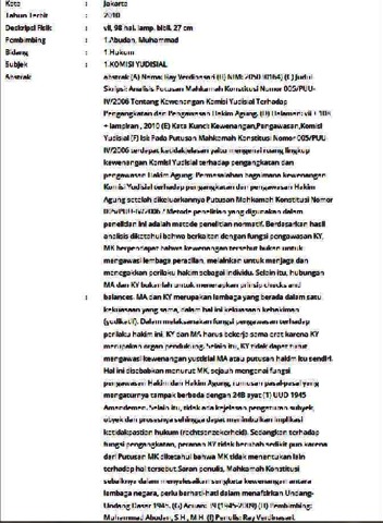 Verdiansari, Ray (2010) Analisis kewenangan komisi yudisial terhadap pengangkatan dan pengawasan hakim agung setelah keluarnya putusan mahkamah konstitusi Nomor 005/PUU-IV/2006. Informasi Detail Skripsi/Thesis. p. 98. ISSN 205030164