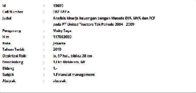 Taya, Meity (2010) Analisis kinerja keuangan dengan Metode EVA, MVA dan FCF pada PT United Tractors Tbk Periode 2004 - 2009. Informasi Detail Skripsi/Thesis. p. 67. ISSN 117082030
