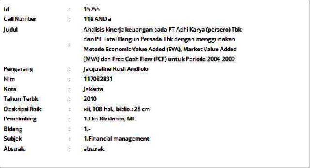 Andilolo, Jacqueline Rusli (2010) Analisis kinerja keuangan pada PT Adhi Karya (persero) Tbk dan PT Total Bangun Persada Tbk dengan menggunakan Metode Economic Value Added (EVA), Market Value Added (MVA) dan Free Cash Flow (FCF) untuk Periode 2004-2009. Informasi Detail Skripsi/Thesis. p. 108. ISSN 117082831
