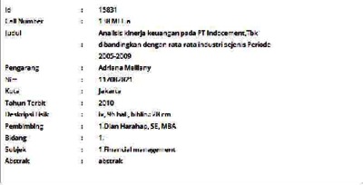 Melliany, Adriana (2010) Analisis kinerja keuangan pada PT Indocement,Tbk dibandingkan dengan rata-rata industri sejenis Periode 2005-2009. Informasi Detail Skripsi/Thesis. p. 96. ISSN 117082821