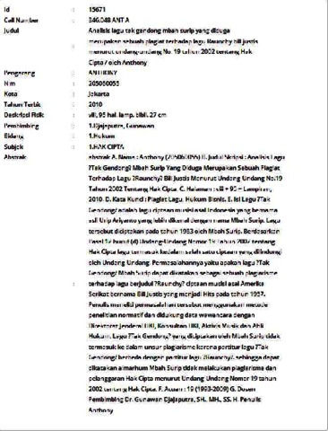 A. Nama : Anthony (205060055) B. Judul Skripsi : Analisis Lagu ?Tak Gendong? Mbah Surip Yang Diduga Merupakan Sebuah Plagiat Terhadap Lagu ?Raunchy? Bill Justis Menurut Undang-Undang No.19 Tahun 2002 Tentang Hak Cipta. C. Halaman : viii + 95 + Lampiran, 2010. D. Kata Kunci : Plagiat Lagu, Hukum Bisnis. E. Isi Lagu ?Tak Gendong? adalah lagu ciptaan musisi asal Indonesia yang bernama asli Urip Ariyanto yang lebih dikenal dengan nama Mbah Surip. Lagu tersebut diciptakan pada tahun 1983 oleh Mbah Surip. Berdasarkan Pasal 12 huruf (d) Undang-Undang Nomor 19 Tahun 2002 tentang Hak Cipta lagu termasuk kedalam salah satu ciptaan yang dilindungi oleh Undang-Undang. Permasalahannya yaitu apakah lagu ?Tak Gendong? Mbah Surip dapat dikatakan sebagai sebuah plagiarisme terhadap lagu berjudul ?Raunchy? ciptaan musisi asal Amerika Serikat bernama Bill Justis yang menjadi Hits pada tahun 1957. Penulis meneliti permasalahan tersebut menggunakan metode penelitian normatif dan didukung data wawancara dengan Direktorat Jenderal HKI, Konsultan HKI, Aktivis Musik dan Ahli Hukum. Lagu ?Tak Gendong? yang diciptakan oleh Mbah Surip tidak termasuk ke dalam unsur plagiarisme karena partitur lagu ?Tak Gendong? berbeda dengan partitur lagu ?Raunchy?. sehingga dapat dikatakan almarhum Mbah Surip tidak melakukan plagiarisme dan pelanggaran Hak Cipta menurut Undang-Undang Nomor 19 tahun 2002 tentang Hak Cipta. F. Acuan : 19 (1993-2009) G. Dosen Pembimbing Dr. Gunawan Djajaputra, SH., MH., SS. H. Penulis Anthony