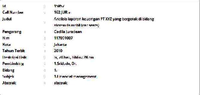 Juradean, Cecilia (2010) Analisis laporan keuangan PT XYZ yang bergerak di bidang aksesoris mobil (car seats). Informasi Detail Skripsi/Thesis. p. 70. ISSN 117091007