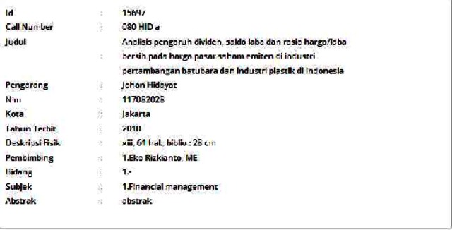 Hidayat, Johan (2010) Analisis pengaruh dividen, saldo laba dan rasio harga/laba bersih pada harga pasar saham emiten di industri pertambangan batubara dan industri plastik di Indonesia. Informasi Detail Skripsi/Thesis. p. 61. ISSN 117082028