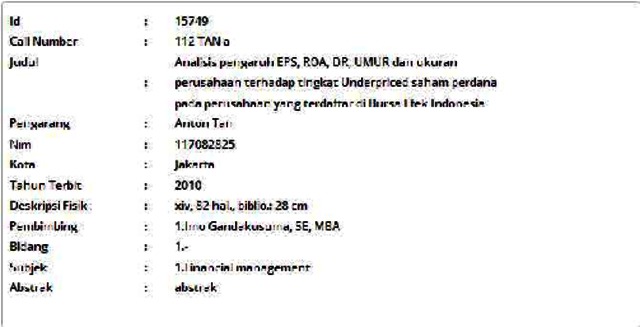 Tan, Anton (2010) Analisis pengaruh EPS, ROA, DR, UMUR dan ukuran perusahaan terhadap tingkat Underpriced saham perdana pada perusahaan yang terdaftar di Bursa Efek Indonesia. Informasi Detail Skripsi. p. 82. ISSN 117082825