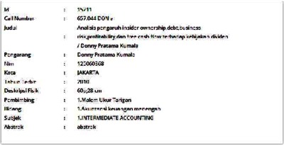 Kumala, Donny Pratama (2010) Analisis pengaruh insider ownership,debt,business risk,profitability,dan free cash flow terhadap kebijakan dividen. Informasi Detail Skripsi/Thesis. p. 60. ISSN 125060368