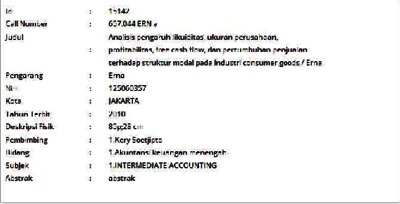 Erna, Erna (2010) Analisis pengaruh likuiditas, ukuran perusahaan, profitabilitas, free cash flow, dan pertumbuhan penjualan terhadap struktur modal pada industri consumer goods. Informasi Detail Skripsi/Thesis. p. 85. ISSN 125060357