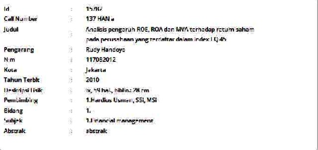 Handoyo, Rudy (2010) Analisis pengaruh ROE, ROA dan MVA terhadap return saham pada perusahaan yang terdaftar dalam index LQ 45. Informasi Detail Skripsi/Thesis. p. 59. ISSN 117082012