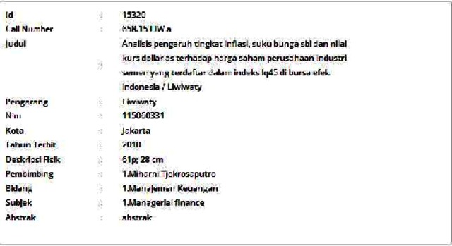 Liwiwaty, Liwiwaty (2010) Analisis pengaruh tingkat inflasi, suku bunga sbi dan nilai kurs dollar as terhadap harga saham perusahaan industri semen yang terdaftar dalam indeks lq45 di bursa efek indonesia. Informasi Detail Skripsi/Thesis. p. 61. ISSN 115060331