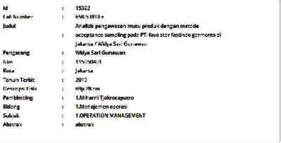 Gunawan, Widya Sari (2010) Analisis pengawasan mutu produk dengan metode acceptance sampling pada PT. favo star fastindo garments di Jakarta. Informasi Detail Skripsi/Thesis. p. 69. ISSN 115050401