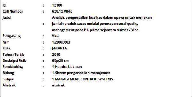 Vina, Vina (2010) Analisis pengendalian kualitas dalam upaya untuk menekan jumlah produk cacat melalui penerapan total quality management pada PT. prima sejahtera sukses. Informasi Detail Skripsi. p. 69. ISSN 125060603