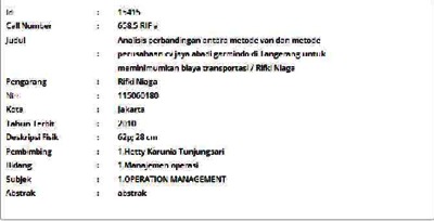 Niaga, Rifki (2010) Analisis perbandingan antara metode van dan metode perusahaan cv jaya abadi garmindo di Tangerang untuk meminimumkan biaya transportasi. Informasi Detail Skripsi. p. 62. ISSN 115060180