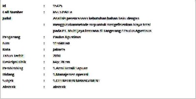 Agustinus, Paulus (2010) Analisis perencanaan kebutuhan bahan baku dengan menggunakanmetode mrp untuk mengefisienkan biaya total pada PT. Multi jaya kencana di Tangerang. Informasi Detail Skripsi. p. 64. ISSN 115040060
