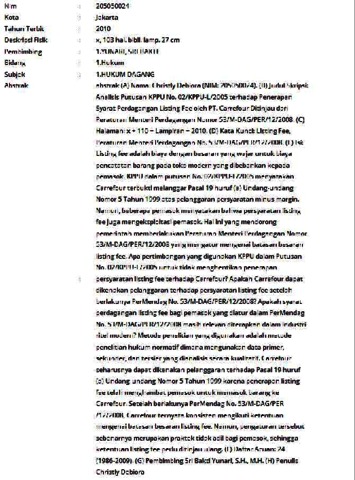 (A) Nama: Christly Debiora (NIM: 205050024). (B) Judul Skripsi: Analisis Putusan KPPU No. 02/KPPU-L/2005 terhadap Penerapan Syarat Perdagangan Listing Fee oleh PT. Carrefour Ditinjau dari Peraturan Menteri Perdagangan Nomor 53/M-DAG/PER/12/2008. (C) Halaman: x + 110 + Lampiran + 2010. (D) Kata Kunci: Listing Fee, Peraturan Menteri Perdagangan No. 53/M-DAG/PER/12/2008. (E) Isi: Listing fee adalah biaya dengan besaran yang wajar untuk biaya pencatatan barang pada toko modern yang dibebankan kepada pemasok. KPPU dalam putusan No. 02/KPPU-L/2005 menyatakan Carrefour terbukti melanggar Pasal 19 huruf (a) Undang-undang Nomor 5 Tahun 1999 atas pelanggaran persyaratan minus margin. Namun, beberapa pemasok menyatakan bahwa persyaratan listing fee juga mengeksploitasi pemasok. Hal ini yang mendorong pemerintah memberlakukan Peraturan Menteri Perdagangan Nomor 53/M-DAG/PER/12/2008 yang mengatur mengenai batasan besaran listing fee. Apa pertimbangan yang digunakan KPPU dalam Putusan No. 02/KPPU-L/2005 untuk tidak menghentikan penerapan persyaratan listing fee terhadap Carrefour? Apakah Carrefour dapat dikenakan pelanggaran terhadap persyaratan listing fee setelah berlakunya PerMendag No. 53/M-DAG/PER/12/2008? Apakah syarat perdagangan listing fee bagi pemasok yang diatur dalam PerMendag No. 53/M-DAG/PER/12/2008 masih relevan diterapkan dalam industri ritel modern? Metode penelitian yang digunakan adalah metode penelitian hukum normatif dimana mengunakan data primer, sekunder, dan tersier yang dianalisis secara kualitatif. Carrefour seharusnya dapat dikenakan pelanggaran terhadap Pasal 19 huruf (a) Undang-undang Nomor 5 Tahun 1999 karena penerapan listing fee telah menghambat pemasok untuk memasok barang ke Carrefour. Setelah berlakunya PerMendag No. 53/M-DAG/PER/12/2008, Carrefour ternyata konsisten mengikuti ketentuan mengenai batasan besaran listing fee. Namun, pengaturan tersebut sebenarnya merupakan praktek tidak adil bagi pemasok, sehingga ketentuan listing fee perlu ditinjau ulang. (F) Daftar Acuan: 24 (1986-2009). (G) Pembimbing Sri Bakti Yunari, S.H., M.H. (H) Penulis Christly Debiora