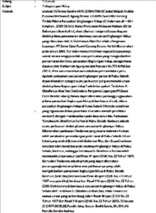 (A) Nama: Sandro (NIM: 205040198) (B) Judul Skripsi: Analisis Putusan Mahkamah Agung Nomor 775 K/Pid.Sus/2007 tentang Tindak Pidana Perusakan Lingkungan Hidup. (C) Halaman: viii + 86 + lampiran , 2009 (D) Kata Kunci: Perbuatan Melawan Hukum. (E) Isi: Dalam penulisan kali ini, akan dibahas mengenai kasus dugaan tindak pidana pencemaran dan/atau perusakan lingkungan hidup yang dilakukan oleh H. Oktafianus Alias Yan selaku Pengawas Lapangan PT.Surya Cipta Rezeki Cabang Batam. Hal ini dikarenakan pada tahun 2006, Yan telah memerintahkan kepada karyawannya untuk secara sengaja melakukan perbuatan yang mengakibatkan pencemaran dan/atau perusakan lingkungan hidup, sebagaimana diputus oleh Mahkamah Agung melalui Putusan No.775 K/Pid.Sus/2007.. Atas kasus tersebut menimbulkan permasalahan yaitu Apakah perbuatan perusakan lingkungan pantai di Pulau Sebaik dapat dikatakan sebagai suatu perbuatan yang memenuhi unsur tindak pidana lingkungan hidup ? selain itu apakah Terdakwa H. Oktafianus Alias Yan (Yan) selaku Pengawas Lapangan PT.Surya Cipta Rezeki Cabang Batam dapat dikenakan pertanggungjawaban pidana perusakan lingkungan hidup dalam kasus tindak pidana perusakan lingkungan hidup di Pulau Sebaik ? Metode penelitian yang digunakan dalam penelitian ini adalah metode penelitian normatif, dengan mendasarkan pada data sekunder. Perbuatan Terdakwa H. Oktafianus Als Yan di Pulau Sebaik, Karimun adalah suatu perbuatan tindak pidana perusakan lingkungan hidup. Dikarenakan perbuatan Terdakwa yang secara melawan hukum telah melakukan penambangan pasir darat di Pulau Sebaik di luar lokasi yang telah diijinkan oleh Gubernur Riau dan Bupati karimun tersebut telah berakibat pada rusaknya lingkungan hidup di Pulau Sebaik, Karimun, sehingga Terdakwa H. Oktafianus Als Yan telah memenuhi unsur-unsur dari Pasal 41 ayat (1) UU No. 23 Tahun 1997. Kemudian Terdakwa adalah pihak yang dapat dikenakan pertanggungjawaban pidana atas perbuatanya yang telah mengakibatkan perusakan lingkungan hidup di Pulau Sebaik, Karimun, baik dikaji berdasarkan Pasal 46 ayat (2) UU No. 23 Tahun 1997 ataupun dikaji berdasarkan Pasal 116 ayat (2) UU No. 32 Tahun 2009. Oleh karena dalam kasus perusakan lingkungan hidup di Pulau Sebaik oleh Terdakwa H. Oktafianus Alias Yan, telah memenuhi semua unsur yang terkandung dalam Pasal 46 ayat (2) UU No. 23 Tahun 1997 dan Pasal 116 ayat (2) UU No. 32 Tahun 2009. (F) Acuan: 25 (1977-2009) (G) Pembimbing: Soetan Budhi Satria, SH, MH. (H) Penulis: Sandro Andrew