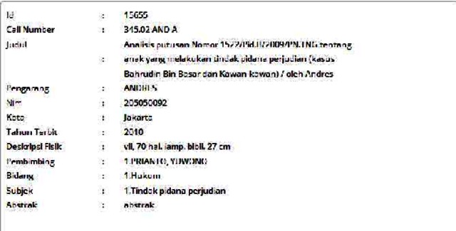 Andres, Andres (2010) Analisis putusan Nomor 1522/Pid.B/2009/PN.TNG tentang anak yang melakukan tindak pidana perjudian (kasus Bahrudin Bin Basar dan Kawan-kawan). Informasi Detail Skripsi. p. 70. ISSN 205050092