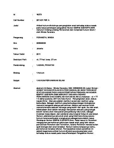 WINDA, FERANETA Akibat hukum ditolaknya penyangkalan anak terhadap status nasab pada kasus penetapan pengadilan Nomor 629/Pdt.G/2010/PA.SMN menurut Undang-undang Perkawinan dan kompilasi hukum Islam / oleh Winda Feraneta. skripsi.