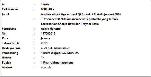 Hartono, Aditya (2010) Analisis seleksi tiga saham LQ45 teraktif Periode Januari 2006 - Desember 2009 dalam membentuk portofolio yang terbaik berdasarkan Sharpe Ratio dan Treynor Ratio. Informasi Detail Thesis. p. 79. ISSN 117082016