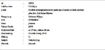 Wijoyo, Yohanes (2010) Analisis strategi pemasaran pada peluncuran produk permen jahe Bon-X di Pasar Filipina. Informasi Detail Thesis. p. 97. ISSN 117082849