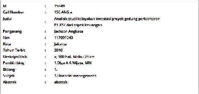 Angkasa, Jackson (2010) Analisis studi kelayakan investasi proyek gedung perkantoran PT XYZ dari aspek keuangan. Informasi Detail Thesis. p. 100. ISSN 117091043