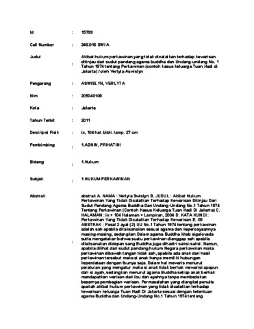 VERLYTA, ASWISLYN Akibat hukum perkawinan yang tidak dicatatkan terhadap kewarisan ditinjau dari sudut pandang agama buddha dan Undang-undang No. 1 Tahun 1974 tentang Perkawinan (contoh kasus keluarga Tuan Hadi di Jakarta) / oleh Verlyta Aswislyn. skripsi.
