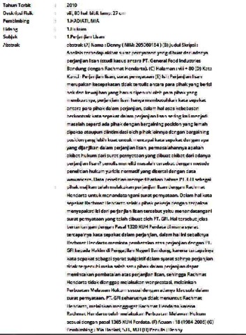 (A) Nama : Denny ( NIM: 205060184 ) (B) Judul Skripsi : Analisis terhadap akibat surat pernyataan yang dibuat dari adanya perjanjian lisan (studi kasus antara PT. General Food Industries Bandung dengan Rachmat Hendarto). (C) Halaman : viii + 80 (D) Kata Kunci : Perjanjian lisan, surat pernyataan (E) Isi : Perjanjian lisan merupakan kesepakatan tidak tertulis antara para pihak yang berisi hak dan kewajiban yang harus dipenuhi oleh para pihak yang membuatnya, perjanjian lisan hanya membutuhkan kata sepakat antara para pihak dalam perjanjian, dalam hal asas kebebasan berkontrak kata sepakat dalam perjanjian lisan sering kali menjadi masalah seperti ada pihak dengan bargaining position yang lemah dipaksa ataupun diintimidasi oleh pihak lainnya dengan bargaining position yang lebih kuat untuk mencapai kata sepakat dengan apa yang dijanjikan dalam perjanjian lisan, permasalahannya apakah akibat hukum dari surat pernyataan yang dibuat akibat dari adanya perjanjian lisan? penulis meneliti masalah tersebut dengan metode penelitian hukum yuridis normatif yang disertai dengan data wawancara. Data penelitian memperlihatkan bahwa PT. GFI sebagai pihak majikan telah melakukan perjanjian lisan dengan Rachmat Hendarto untuk menandatangani surat pernyataan. Dalam hal kata sepakat Rachmat Hendarto selaku pihak pekerja dengan terpaksa menyepakati isi dari perjanjian lisan tersebut yaitu menandatangani surat pernyataan yang telah dibuat oleh PT. GFI. Hal tersebut jelas bertentangan dengan Pasal 1320 KUH Perdata di mana syarat tercapainya kata sepakat dalam perjanjian, dalam hal ini sebaiknya Rachmat Hendarto meminta pembatalan atas perjanjian dengan PT. GFI kepada Hakim di Pengadilan Negeri Bandung, karena tercapainya kata sepakat sebagai syarat subjektif dalam syarat sahnya perjanjian tidak terpenuhi maka salah satu pihak dalam perjanjian dapat memintakan pembatalan atas perjanjian lisan, sehingga Rachmat Hendarto tidak dianggap melakukan wanprestasi, melainkan Perbuatan Melawan Hukum sesuai dengan adanya klausula dalam surat pernyataan. PT. GFI seharusnya tidak menuntut Rachmat Hendarto, melainkan menggugat Rachmat Hendarto karena Rachmat Hendarto telah melakukan Perbuatan Melawan Hukum sesuai dengan pasal 1365 KUH Perdata. (F) Acuan : 18 (1984-2006) (G) Pembimbing : Mia Hadiati, S.H., M.H (H) Penulis : Denny