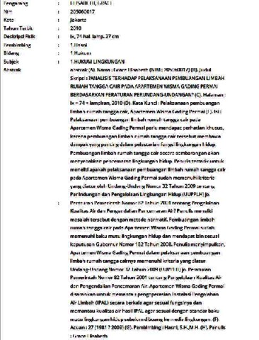 Elisabeth, Grace (2010) Analisis terhadap pelaksanaan pembuangan limbah rumah tangga cair pada apartemen wisma gading permai berdasarkan peraturan perundang-undangan. Informasi Detail Skripsi. p. 74. ISSN 205060017