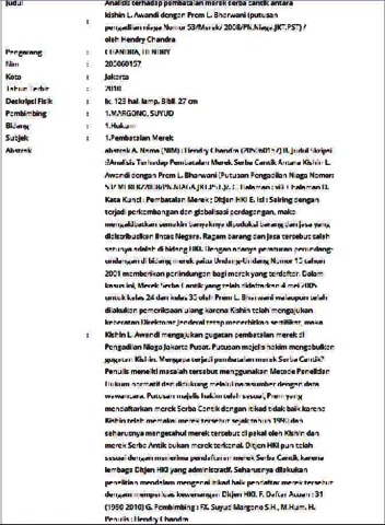 Chadra, Hendry (2010) Analisis terhadap pembatalan merek serba cantik antara kishin L. Awandi dengan Prem L. Bharwani (putusan pengadilan niaga Nomor 53/Merek/ 2008/PN.Niaga.JKT.PST). Informasi Detail Skripsi. p. 123. ISSN 205060157