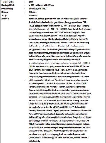 A. Nama : Julia Belinda NIM : 205060146 B. Judul Skripsi : Analisis Terhadap Perlindungan Hukum Penggunaan Frase CAP TIKUS Sebagai Merek Ditinjau Dari UU NO. 15 Tahun 2001 Tentang Merek C. Halaman : xii + 175 + 15 + 2010 D. Kata Kunci : Perlindungan Hukum Penggunaan Frase CAP TIKUS, Indikasi Geografis Dari Masyarakat Minahasa Sulawesi Utara. E. Isi: Indikasi Geografis sebagai suatu tanda dilindungi dalam Undang-Undang Nomor 15 Tahun 2001 tentang Merek dan PP Nomor 51 Tahun 2007 tentang Indikasi Geografis. Oleh karena dilindungi oleh hukum, maka penggunaan suatu Indikasi Geografis oleh pihak yang tidak berhak akan merugikan masyarakat pemilik Indikasi Geografis, baik untuk Indikasi Geografis yang dikenal ataupun Indikasi Geografis terdaftar. Permasalahan yang penulis teliti adalah Mengapa terjadi ketidaksesuaian antara proses pemeriksaan substantif oleh DIRJEN HKI dengan ketentuan yang sudah diatur dalam UU No. 15 Tahun 2001 Tentang Merek dan PP No. 51 Tahun 2007 Tentang Indikasi Geografis? Bagaimana perlindungan hukum terhadap Indikasi Geografis yang belum terdaftar minuman dengan frase CAP TIKUS milik masyarakat Minahasa? Penelitian ini menggunakan metode penelitian yuridis normatif. Berdasarkan UU No. 15 Tahun 2001 Tentang Merek dan PP Nomor 51 Tahun 2007 tentang Indikasi Geografis telah terjadi ketidaksesuaian dalam proses pemeriksaan substantif yang disebabkan alasan yang bersifat non-substantif yaitu perbedaan wawasan yang dimiliki masing-masing pemeriksa merek karena kriteria untuk menjadi pemeriksa merek kurang memadai tanpa didukung dengan petunjuk tekhnis yang lebih lengkap dan memadai. Berdasarkan Pasal 56 Ayat (2) UU No. 15 Tahun 2001 Tentang Merek dan Pasal 2 Ayat (3) Peraturan Pemerintah Nomor 51 Tahun 2007 tentang Indikasi Geografis bahwa sifat pendaftaran Indikasi Geografis adalah wajib di mana Indikasi Geografis mendapat perlindungan setelah terdaftar atas dasar permohonan, maka CAP TIKUS masyarakat Minahasa tidak mendapat perlindungan hukum. Masyarakat Minahasa diharapkan segeran mendaftarkan Cap Tikus sebagai Indikasi Geografis. Direktorat Jendral diharapkan untuk membuat petunjuk tekhnis yang lebih memadai. F. Acuan : 40 (1983-2010) G. Pembimbing : Sri Bakti Yunari, S.H., M.H H. Penulis : Julia Belinda