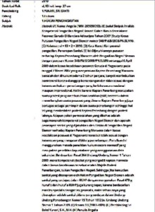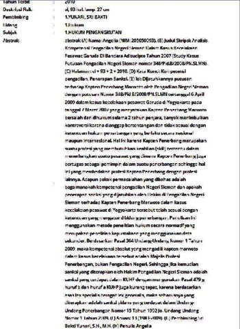 (A) Nama: Angelia (NIM: 205050093). (B) Judul Skripsi: Analisis Kompetensi Pengadilan Negeri Sleman Dalam Kasus Kecelakaan Pesawat Garuda Di Bandara Adisucipto Tahun 2007 (Study Kasus Putusan Pengadilan Negeri Sleman nomor 348/Pid.B/2008/PN.SLMN). (C) Halaman: vi + 93 + 2 + 2010. (D) Kata Kunci: Kompetensi pengadilan, Penerapan Sanksi. (E) Isi: Dijatuhkannya putusan terhadap Kapten Penerbang Marwoto oleh Pengadilan Negeri Sleman dengan putusan Nomor 348/Pid.B/2008/PN.SLMN tertanggal 6 April 2009 dalam kasus kecelakaan pesawat Garuda di Yogyakarta pada tanggal 7 Maret 2007 yang menyatakan Kapten Penerbang Marwoto bersalah dan dihukum selama 2 tahun penjara, banyak menimbulkan kontroversi karena dianggap bertentangan dan tidak sesuai dengan ketentuan hukum penerbangan yang berlaku secara nasional maupun internasional. Hal ini karena Kapten Penerbang merupakan suatu profesi yang membutuhkan keahlian (skill) tertentu dalam menerbangkan suatu pesawat yang dimana Kapten Penerbang juga bertugas sebagai pemimpin dalam suatu penerbangan sehingga hal ini yang membedakan profesi Kapten Penerbang dengan profesi lainnya. Adapun pokok permasalahan yang dibahas adalah bagaimanakah kompetensi pengadilan Negeri Sleman dan apakah penerapan sanksi yang dijatuhkan oleh Hakim di Pengadilan Negeri Sleman terhadap Kapten Penerbang Marwoto dalam kasus kecelakaan pesawat di Yogyakarta tersebut telah sesuai dengan ketentuan yang mengatur dibidang penerbangan. Penulisan ini menggunakan metode penelitian hukum secara normatif yang merupakan penelitian kepustakaan yang menggunakan data sekunder. Berdasarkan Pasal 364 Undang-Undang Nomor 1 Tahun 2009, maka kompetensi absolut yang mengadili kapten marwoto dalam kasus kecelakaan tersebut adalah Majelis Profesi Penerbangan, bukan Pengadilan Negeri. Sehingga jika kemudian sanksi yang diterapkan oleh Hakim Pengadilan Negeri Sleman adalah sanksi yang terdapat dalam KUHP dengan mengunakan Pasal 479 g huruf b dan huruf a KUHP juga kurang tepat, karena berdasarkan asas lex specialis derogat lex generalis, maka seharusnya yang diterapkan adalah sanksi pidana yang terdapat dalam Undang-Undang Penerbangan Nomor 15 Tahun 1992 Jo. Undang-Undang Nomor 1 Tahun 2009. (F) Acuan: 13 (1983-2009). (G) Pembimbing Sri Bakti Yunari, S.H., M.H. (H) Penulis Angelia