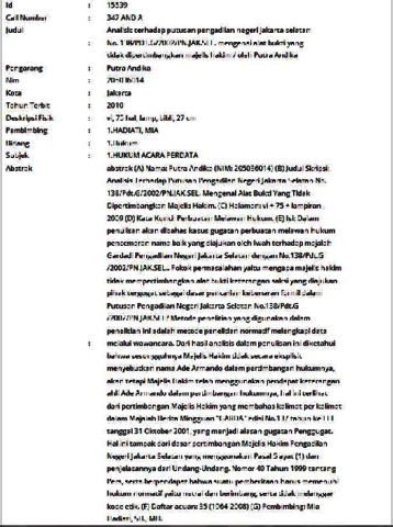 (A) Nama: Putra Andika (NIM: 205036014) (B) Judul Skripsi: Analisis Terhadap Putusan Pengadilan Negeri Jakarta Selatan No. 138/Pdt.G/2002/PN.JAK.SEL. Mengenai Alat Bukti Yang Tidak Dipertimbangkan Majelis Hakim. (C) Halaman: vi + 75 + lampiran , 2009 (D) Kata Kunci: Perbuatan Melawan Hukum. (E) Isi: Dalam penulisan akan dibahas kasus gugatan perbuatan melawan hukum pencemaran nama baik yang diajukan oleh Iwah terhadap majalah Gardadi Pengadilan Negeri Jakarta Selatan dengan No.138/Pdt.G/2002/PN.JAK.SEL.. Pokok permasalahan yaitu mengapa majelis hakim tidak mempertimbangkan alat bukti keterangan saksi yang diajukan pihak tergugat sebagai dasar pencarian kebenaran formil dalam Putusan Pengadilan Negeri Jakarta Selatan No.138/Pdt.G/2002/PN.JAK.SEL? Metode penelitian yang digunakan dalam penelitian ini adalah metode penelitian normatif melengkapi data melalui wawancara. Dari hasil analisis dalam penulisan ini diketahui bahwa sesungguhnya Majelis Hakim tidak secara eksplisit menyebutkan nama Ade Armando dalam pertimbangan hukumnya, akan tetapi Majelis Hakim telah menggunakan pendapat keterangan ahli Ade Armando dalam pertimbangan hukumnya, hal ini terlihat dari pertimbangan Majelis Hakim yang membahas kalimat per kalimat dalam Majalah Berita Mingguan "GARDA" edisi No.137 tahun ke I I I tanggal 31 Oktober 2001, yang menjadi alasan gugatan Penggugat. Hal ini tampak dari dasar pertimbangan Majelis Hakim Pengadilan Negeri Jakarta Selatan yang menggunakan Pasal 5 ayat (1) dan penjelasannya dari Undang-Undang. Nomor 40 Tahun 1999 tentang Pers, serta berpendapat bahwa suatu pemberitaan harus memenuhi hukum normatif yaitu netral dan berimbang, serta tidak melanggar kode etik. (F) Daftar acuan: 35 (1964-2008) (G) Pembimbing: Mia Hadiati, SH., MH.