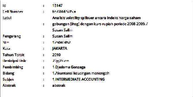 Salim, Susan (2010) Analisis volatility spillover antara indeks harga saham gabungan [ihsg] dengan kurs rupiah periode 2008-2009. Informasi Detail Skripsi. p. 70. ISSN 125040452