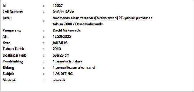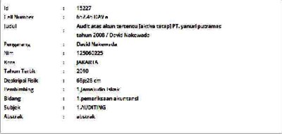 Nakewada, David (2010) Audit atas akun tertentu [aktiva tetap] PT. yanuri putramas tahun 2008. Informasi Detail Skripsi. p. 68. ISSN 125060225