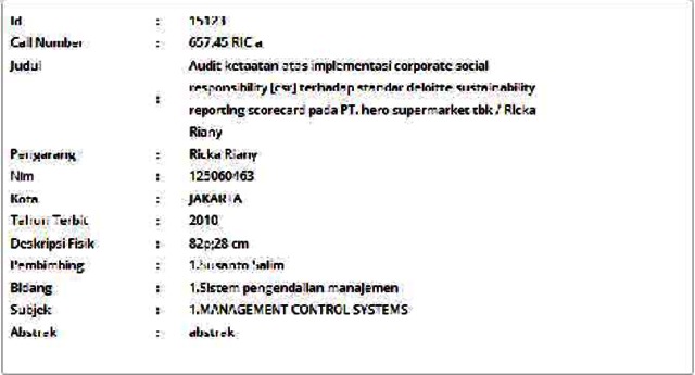 Riany, Ricka (2010) Audit ketaatan atas implementasi corporate social responsibility [csr] terhadap standar deloitte sustainability reporting scorecard pada PT. hero supermarket tbk. Informasi Detail Skripsi. p. 82. ISSN 125060463