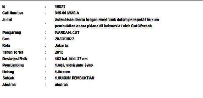 Wardah, Cut (2010) Autentikasi tanda tangan elektronik dalam perspektif hukum pembuktian acara pidana di Indonesia / oleh Cut Wardah. Informasi Detail Skripsi. p. 162. ISSN 207082022