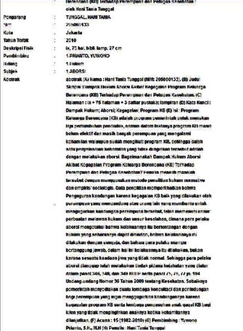 (A) Nama : Hani Tania Tunggal (NIM: 205060133). (B) Judul Skripsi :Dampak Hukum Aborsi Akibat Kegagalan Program Keluarga Berencana (KB) Terhadap Perempuan dan Petugas Kesehatan. (C) Halaman : ix + 75 halaman + 3 daftar pustaka; lampiran (D) Kata Kunci : Dampak Hukum; Aborsi; Kegagalan; Program KB (E) Isi : Program Keluarga Berencana (KB) adalah program pemerintah untuk menekan laju pertumbuhan penduduk, namun dalam faktanya program KB masih belum efektif dan masih banyak perempuan yang mengalami kehamilan walaupun sudah mengikuti program KB, sehingga salah satu penyelesaian kehamilan yang tidak diinginkan tersebut adalah dengan melakukan aborsi. Bagaimanakah Dampak Hukum Aborsi Akibat Kegagalan Program Keluarga Berencana (KB) Terhadap Perempuan dan Petugas Kesehatan? Penulis meneliti masalah tersebut dengan menggunakan metode penelitian hukum normative dan empiris/ sosiologis. Data penelitian memperlihatkan bahwa Penguguran kandungan karena kegagalan KB baik yang dilakukan oleh perempuan yang mengandung atau orang lain yang membantu untuk mengugurkan kandungan perempuan tersebut, telah memenuhi unsur perbuatan melawan hukum dan unsur kesalahan, dimana para pelaku aborsi mengetahui bahwa kelakuannya itu bertentangan dengan hukum yang seharusnya dapat dihindari, bahwa kelakuannya itu dilakukan dengan sengaja, dan bahwa para pelaku mampu bertanggung jawab, dalam hal ini kelakuannya itu dilakukan, bukan karena sesuatu keadaan jiwa yang tidak normal. Sehingga para pelaku aborsi dianggap telah melakukan tindak pidana kejahatan yang diatur dalam pasal 346, 348, dan 349 KUHP serta pasal 75, 76, 77 jo. 194 Undang-undang Nomor 36 Tahun 2009 tentang Kesehatan. Sebaiknya pemerintah menyediakan suatu lembaga konsultasi dan perlindungan bagi perempuan yang ingin menggugurkan kandungannya karena kegagalan program KB serta lembaga pengasuhan anak gagal KB bagi klien yang tidak menginginkan anaknya ketika kehamilannya dilanjutkan. (F) Acuan : 15 (1982-2010) (G) Pembimbing : Yuwono Prianto, S.H., M.H (H) Penulis : Hani Tania Tunggal