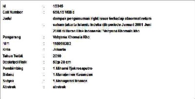 Khomala kho, Vebyana (2010) dampak pengumuman right issue terhadap abnormal return saham jakarta islamic indeks (jii) periode Januari 2001-Juni 2008 di Bursa Efek Indonesia. Informasi Detail Skripsi. p. 59. ISSN 115060383