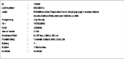 Hendy, Jap (2010) Efektifitas iklan Pepsodent versi sikat gigi pagi + malam dalam meningkatkan frekuensi pembelian produk. Informasi Detail Thesis. p. 87. ISSN 117082006