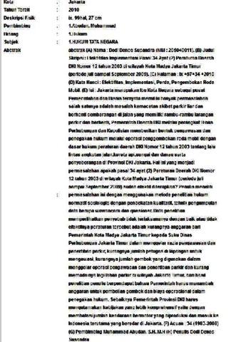 (A) Nama : Dodi Denes Susandra (NIM : 205040011). (B) Judul Skripsi : Efektifitas Implementasi Pasal 34 Ayat (2) Peraturan Daerah DKI Nomor 12 tahun 2003 di wilayah Kota Madya Jakarta Timur (periode juli sampai September 2009). (C) Halaman : ix +97+34 +2010 (D) Kata Kunci : Efektifitas, Implementasi, Perda, Pengembokan Roda Mobil. (E) Isi : Jakarta merupakan Ibu Kota Negara sebagai pusat Pemerintahan dan Bisnis ternyata memiliki banyak permasalahan salah satunya adalah masalah kemacetan akibat parkir liar dan berhenti sembarangan di jalan yang memiliki rambu-rambu larangan parkir dan berhenti, Pemerintah Daerah DKI melalui perangkat Dinas Perhubungan dan Kepolisian memberikan bentuk pengawasan dan penegakan hukum melalui operasi penggembokan roda mobil dengan dasar hukum peraturan daerah DKI Nomor 12 tahun 2003 tentang lalu lintas angkutan jalan,kereta api,sungai dan danau serta penyeberangan di Provinsi DKI Jakarta. Hal ini yang menjadi permasalahan apakah pasal 34 ayat (2) Peraturan Daerah DKI Nomor 12 tahun 2003 di wilayah Kota Madya Jakarta Timur (periode juli sampai September 2009) sudah efektif diterapkan? Penulis meneliti permasalahan ini dengan menggunakan metode penelitian hukum normatif sosiologis dengan pendekatan kualitatif, tehnik pengumpulan data berupa wawancara dan quesioner. Data penelitian memperlihatkan penyebab tidak terlaksananya dengan baik atau tidak efektifnya peraturan tersebut adalah kurangnya anggaran dari Pemerintah Kota Madya Jakarta Timur kepada Suku Dinas Perhubungan Jakarta Timur dalam menggelar razia pengawasan dan penertiban parkir, kurangnya jumlah petugas di lapangan untuk mengawasi, kurangnya jumlah gembok yang digunakan dalam menggelar operasi pengawasan dan penertiban parkir dan kurang memadainya lagi lahan parkir di wilayah Jakarta Timur. dari hasil penelitian penulis berpendapat bahwa Pemerintah harus menambah anggaran untuk pembelian gembok dan biaya operasional dalam penegakan hukum. Sebaiknya Pemerintah Provinsi DKI harus mengutamakan kebijakan yang lebih komprehensif yaitu dengan membatasi jumlah kendaraan bermotor yang diproduksi dan masuk ke Indonesia terutama yang beredar di Jakarta. (F) Acuan : 34 (1983-2008) (G) Pembimbing Muhammad Abudan, S.H.,M.H (H) Penulis Dodi Denes Susandra