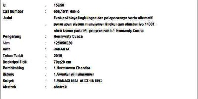 Cuaca, Henniwaty (2010) Evaluasi biaya lingkungan dan pelaporannya serta alternatif penerapan sistem manajemen lingkungan standar iso 14001-studi kasus pada PT. papyrus sakti. Informasi Detail Skripsi. p. 70. ISSN 125050020