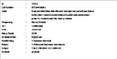Oktaria, Nancy (2010) Evaluasi efektifitas dab efisiensi manajemen persediaan bahan baku dalam rangka meningkatkan keuntungan perusahaan pada PT. mustika ratu tbk. Informasi Detail Skripsi. p. 66. ISSN 125060560