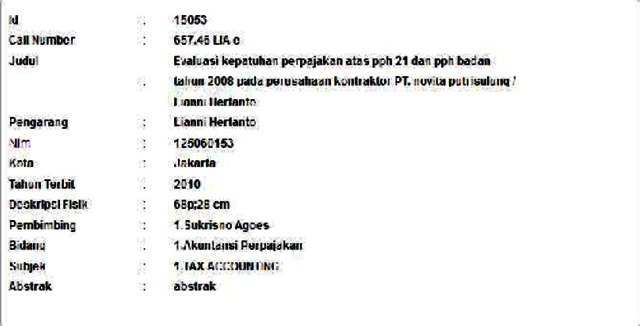Hertanto, Lianni (2010) Evaluasi kepatuhan perpajakan atas pph 21 dan pph badan tahun 2008 pada perusahaan kontraktor PT. novita putrisulung. Informasi Detail Skripsi. p. 68. ISSN 125060153